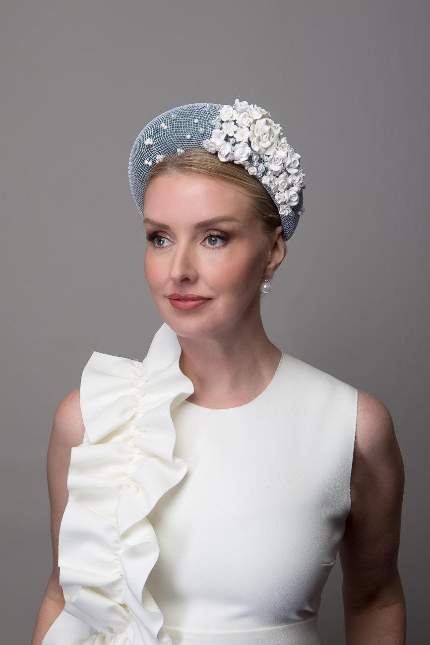 Here Wendy has used one of her high headband shapes and has covered it in a teal sinamay. This has been completely wrapped in a white mesh fabric. This creates a soft and understated look.